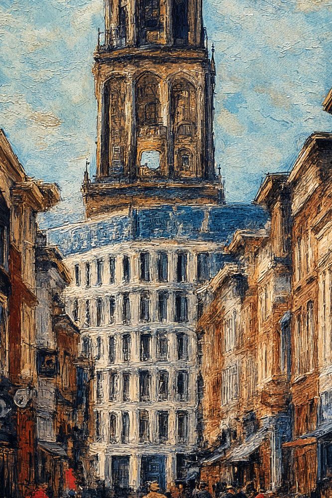 La rue serpente à travers l'œuvre comme un ruban vivant, flanquée de façades caractéristiques pleines de détails. Chaque pierre semble soigneusement posée, chaque ombre délibérément placée. La lumière joue sur les fenêtres, les façades et les pavés comme pour caresser la ville. Les Martinitoren au loin deviennent non seulement un point final de la perspective, mais aussi un symbole de retour à la maison, familier, grandiose et impressionnant dans sa simplicité.