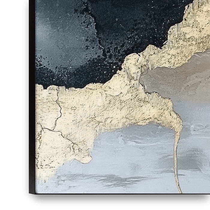 Abstrait or - Cette peinture abstraite présente une composition dynamique de textures fluides et superposées en or, noir et blanc, donnant une impression d'éléments naturels tels que des rochers ou des reflets d'eau.