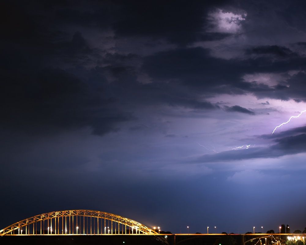 Le tonnerre et les éclairs illuminent le ciel au-dessus d'un Waal calme. Les nuages sombres au-dessus du pont sont juste éclairés par un éclair descendant.