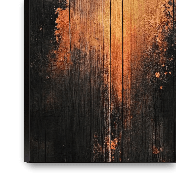 Orange Noir - Cette peinture abstraite dégage une forte intensité, avec un cœur orange vif qui se fond progressivement dans des tons sombres, presque noirs, sur les bords, séparés par des textures de bois naturel qui apportent de la profondeur.