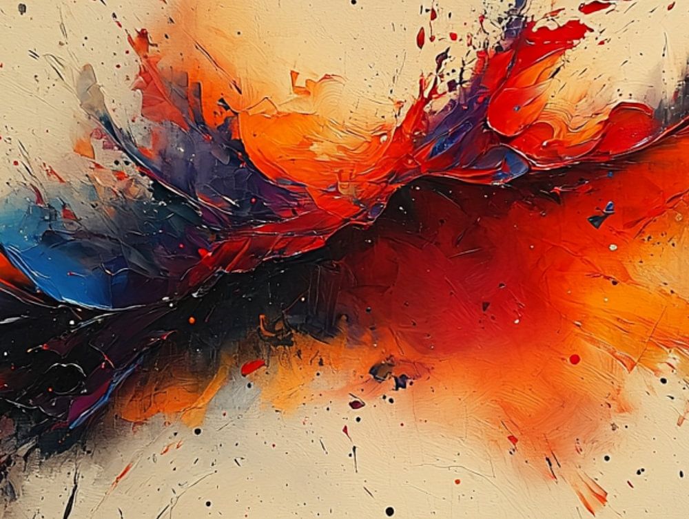 Une explosion d'orange et de bleu éclabousse puissamment la toile. Les zones de couleur s'entrechoquent et se mélangent dans une énergie ardente. Des coups de pinceau dynamiques suggèrent le mouvement et l'émotion. Cette scène abstraite évoque à la fois le chaos et la beauté. La lumière et l'obscurité dansent en contraste, tandis que les couleurs dépeignent une tempête intérieure qui continue à se répercuter.