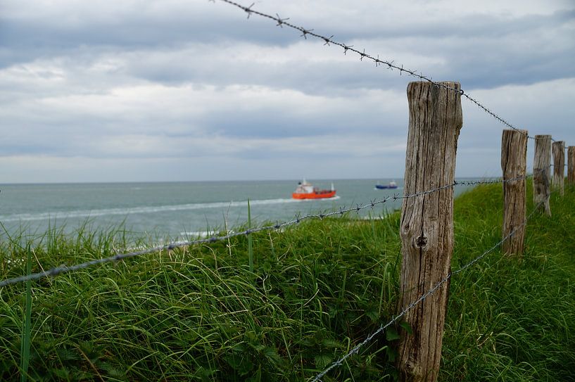 Foto van een oranje schip, genomen vanaf boven op een duin in de buurt van Westkapelle.