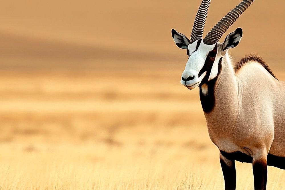 Dans l'immensité rougeoyante de la savane se dresse majestueusement un animal aux élégantes et longues cornes qui se penchent vers le ciel comme des œuvres d'art. Son pelage doux et souple se fond parfaitement dans le paysage doré, tandis que sa silhouette impressionnante dégage une aura de grâce et de force. Cette sérénité reflète la beauté intacte de la nature.
