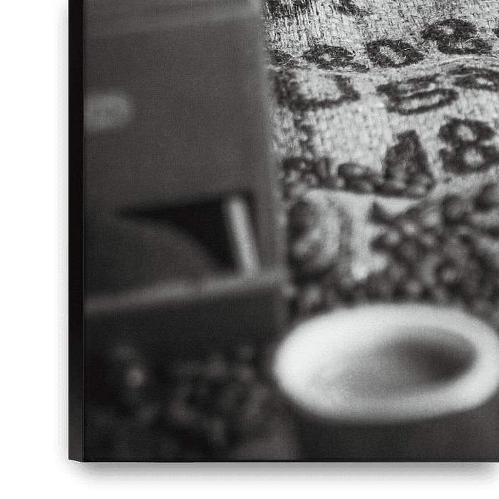Image d'ambiance mettant en évidence le texte des sacs en toile de jute dans lesquels le café était transporté. Complété par un moulin à café nostalgique et une tasse de café expresso.