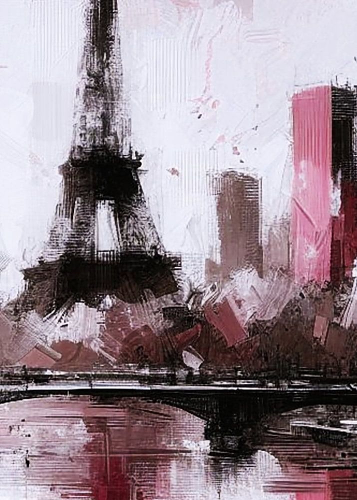Variante de couleur avec rouge foncé. Vue romantique de la ligne d'horizon de Paris, peinte de manière abstraite et pasteus. Au bord de la Seine et bien sûr avec la Tour Eiffel. Technique mixte moderne, créée numériquement. 12/2024 by Pia Schneider, atelier COLOUR-VISION