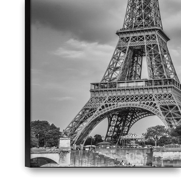 La Tour Eiffel à Paris, haute de 324 mètres, domine le paysage urbain. C'est l'un des sites les plus visités au monde. Voici une vue typique de la Tour Eiffel. Impression monochrome classique des bords de Seine.