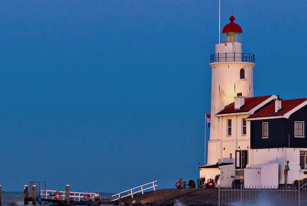 Une photo de la tour lumineuse appelée Paard van Marken - Cheval de Marken - après le coucher du soleil.