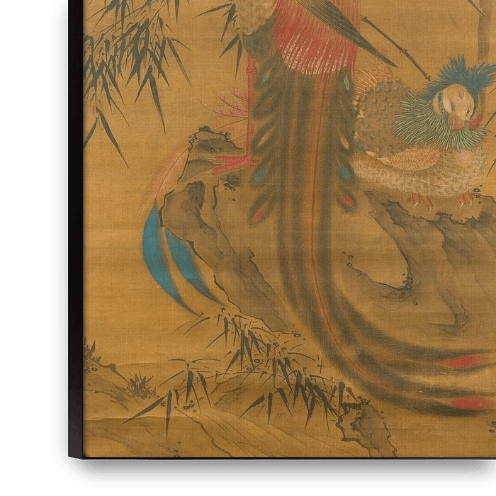 Paire de phénix dans un paysage avec des bambous, des rochers et un ruisseau