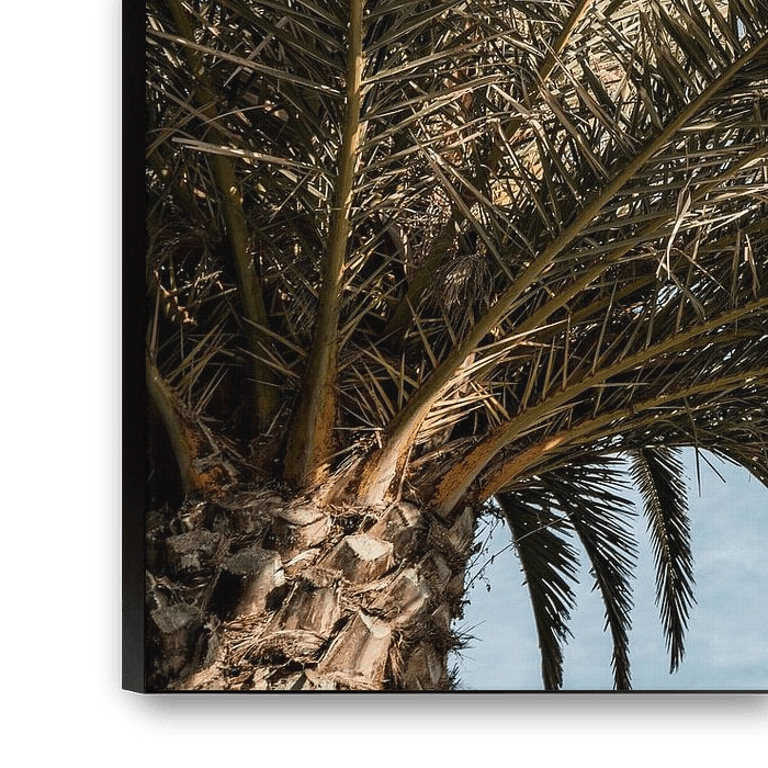 Cette photo ensoleillée d'un palmier à Albufeira, au Portugal, montre le gracieux éventail de feuilles courbées qui s'étendent sur un ciel clair. La lumière chaude accentue les verts éclatants et la texture des feuilles, tandis qu'un second palmier apparaît subtilement à l'arrière-plan. La photo dégage une atmosphère détendue et tropicale, évoquant des souvenirs de journées d'été et de voyages en Méditerranée. Une œuvre d'art élégante et fraîche qui s'intègre parfaitement dans les intérieurs à l'ambiance naturelle ou bohème.