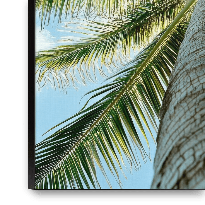 Devant toi s'élève un majestueux tronc de palmier, dont la texture lisse et grise contraste de manière impressionnante avec les feuilles d'un vert éclatant qui se déploient comme un toit vivant. Le ciel d'un bleu éclatant constitue la toile de fond parfaite, tandis que les rayons du soleil dansent à travers les feuilles filigranes et…