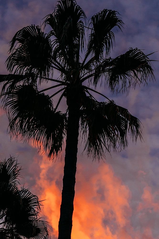Palmiers sur l'île espagnole de Majorque au coucher du soleil. Les couleurs étaient très vives et spectaculaires et se détachaient magnifiquement sur les silhouettes des palmiers.