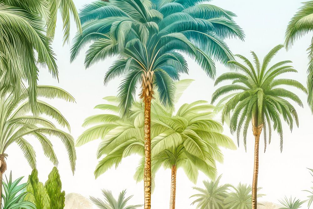 Des palmiers dans un environnement tropical, un décor exotique sous un soleil radieux. Une flore et une faune variées qui s'épanouissent à leur ombre. Une atmosphère paisible et enchanteresse au milieu de la splendeur tropicale.