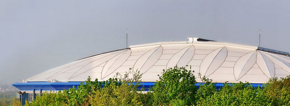 Vue panoramique de la Veltins Arena à Gelsenkirchen et à gauche en arrière-plan la ligne d'horizon d'Essen