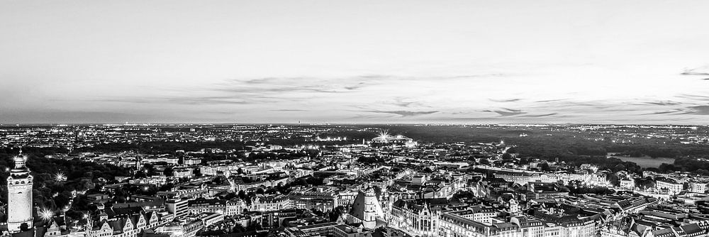 Achetez cette œuvre d'art de paysage Panorama Skyline Leipzig de nuit - Monochrome par Werner Dieterich sur toile, aluminium, ArtFrame ou photographie (encadrée), impression d'art en haute qualité et tout format.