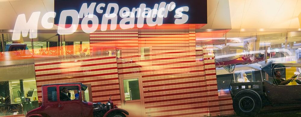 Une photo créative d'un restaurant McDonald's à l'heure bleue. Il s'agit d'une double prise de vue où la deuxième photo est déformée. Dans l'allée, un hotrod, un ratrod et un classique des années 50 attendent leur tour. La prise de vue est affichée en panorama.
