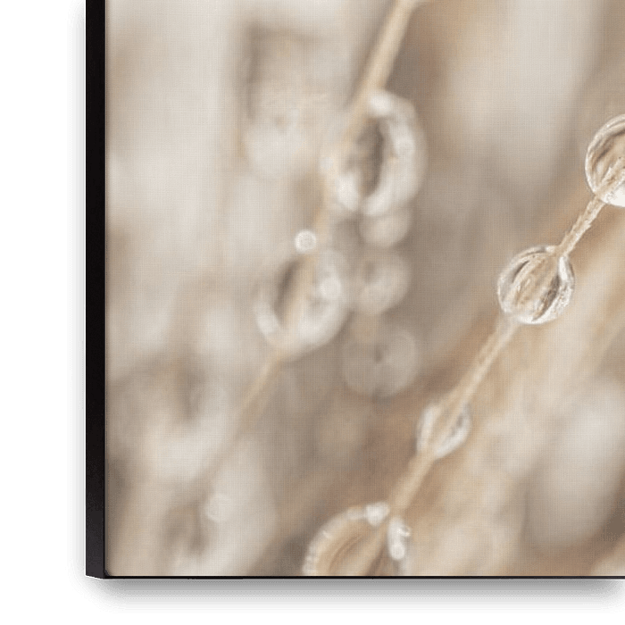 "Panorama abstraction naturelle : Gouttes sur épis d'herbe" est une photo macro d'un certain nombre de gouttes d'eau accrochées à un épi d'herbe (lamproie). Les couleurs de cette photo lui donnent un aspect naturel. Les nuances de brun (y compris le beige et le taupe) et le fond gris-brun y veillent en partie. La…