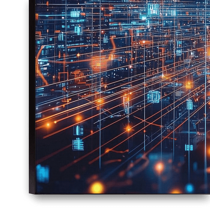 Panorama conceptuel de la ligne d'horizon d'une ville, éclairée par la lueur des néons et des éléments du monde numérique, qui capture l'énergie de la vie urbaine.