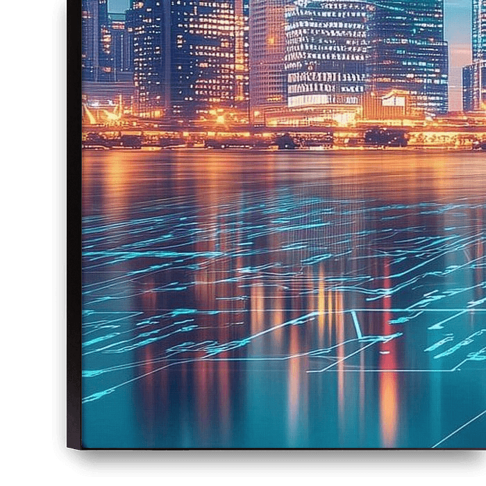 Panorama conceptuel de la ligne d'horizon d'une ville, éclairée par la lueur des néons et des éléments du monde numérique, qui capture l'énergie de la vie urbaine.