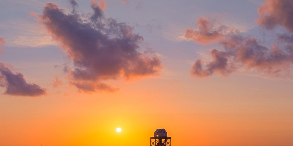 Image panoramique 2:1 d'un coucher de soleil aux couleurs atmosphériques chaudes au nouveau poste des Wadden de l'Office national des forêts, "De Kalkman" (également appelé Drenkelingenhuisje) sur l'Engelsmanplaat, un banc de sable situé entre les îles des Wadden Ameland et Schiermonnikoog et uniquement accessible à Ebb.