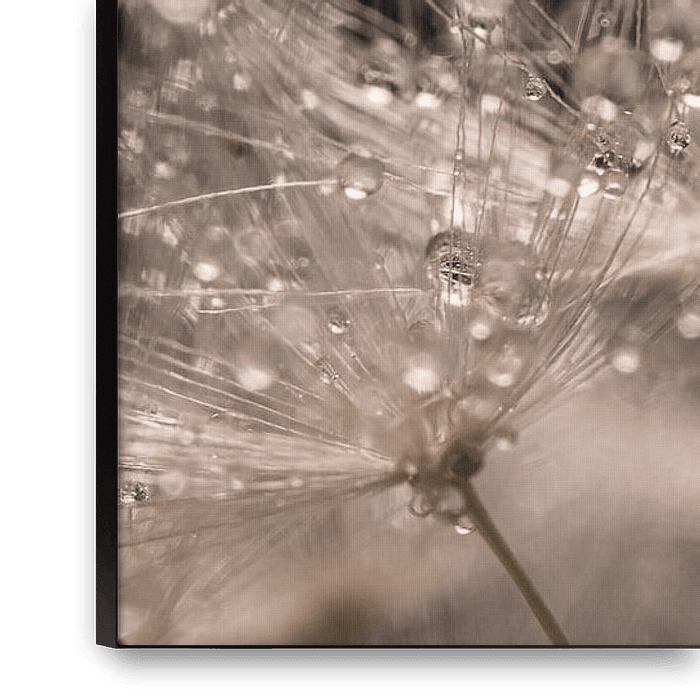 La profondeur de champ est faible, ce qui crée une atmosphère de rêve et une sensation de profondeur dans l'œuvre. Les gouttes contribuent également à créer cette atmosphère de rêve, elles reflètent la lumière et créent des étincelles dans les gouttes entre les peluches du pissenlit.