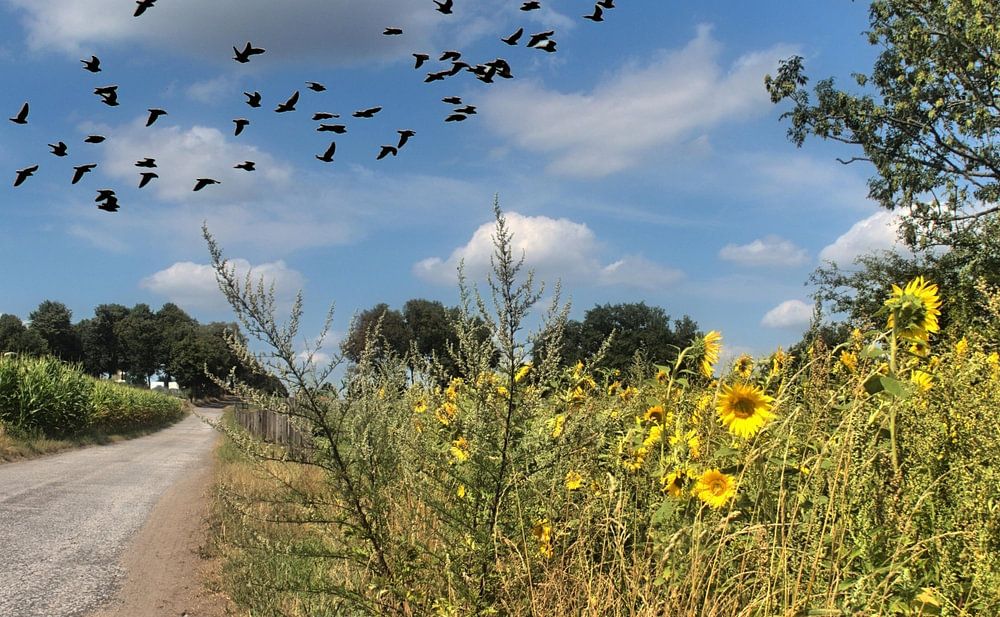 Tournesols, chemin de terre et oiseaux en vol sur un chemin de terre à l'Ortbeckstrasse à Gelsenkirchen-Middelich. Tiers classique Répartition de l'image