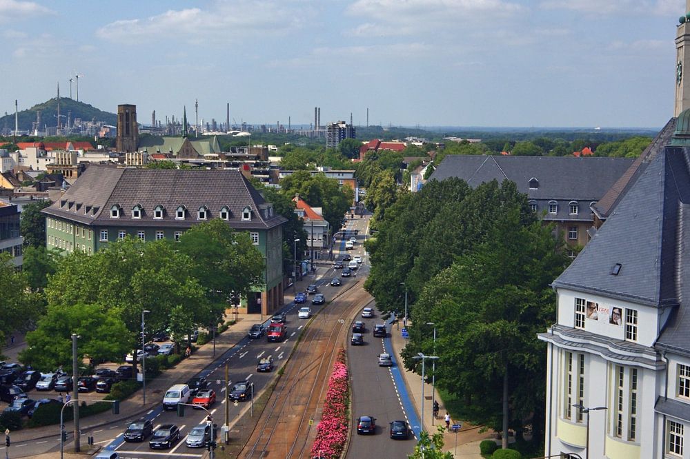 Vue de Gelsenkirchen-Buer avec la tour de la mairie et la De-La-Chevalerie Strasse ainsi que Gelsenkirchen-Scholven en arrière-plan.