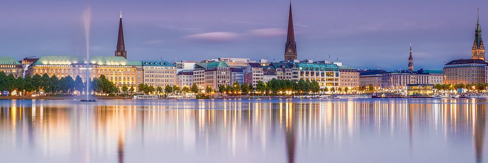 La ville de Hambourg dans le nord de l'Allemagne avec l'Alster intérieur de Hambourg dans une lumière du soir pastel et évocatrice.