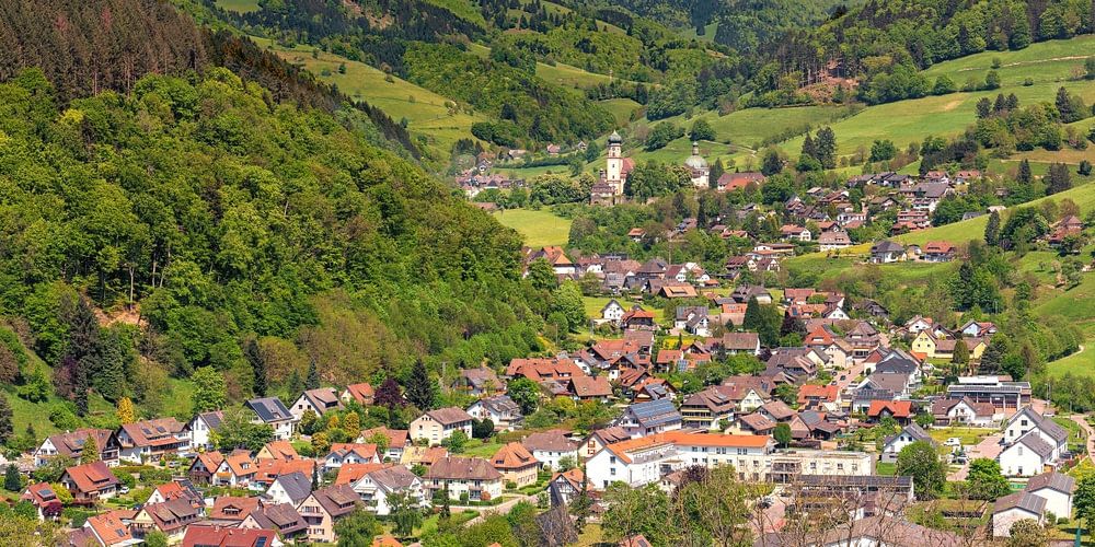 Ce panorama impressionnant montre la pittoresque vallée de Münster dans la Forêt-Noire dans toute sa beauté. Les maisons traditionnelles du village se blottissent harmonieusement dans la vallée verdoyante entre les collines boisées. En arrière-plan, on reconnaît le monastère historique de Sankt Trudpert avec ses tours caractéristiques. Des prairies verdoyantes et des forêts denses encadrent le village idyllique. Le ciel d'un bleu éclatant, parsemé de nuages blancs, complète ce paysage paisible et rend palpable l'atmosphère typique de la Forêt-Noire.