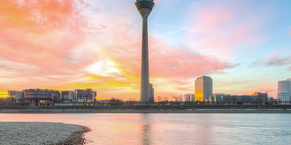 Le matin à Düsseldorf, au bord du Rhin, avec vue sur la tour du Rhin et le port des médias, juste avant le lever du soleil.