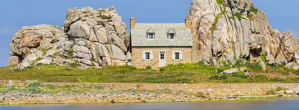 Une photo panoramique XPan 65:24 des chalets les plus photographiés de Bretagne. Castel Meur, également connu sous le nom de La Maison du Gouffre, est une charmante chaumière coincée entre deux énormes rochers pointus.