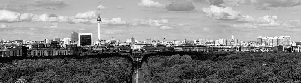 L'horizon berlinois avec de nombreux sites célèbres comme le Tiergarten, la tour de télévision, la porte de Brandebourg, la Potsdamer Platz et la rue du 17 juin.