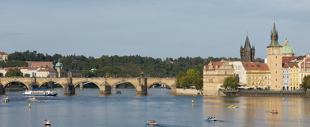 Vue panoramique de la vieille ville de Prague avec, en arrière-plan, la rivière Vltava et le pont Charles, très apprécié des touristes du monde entier.