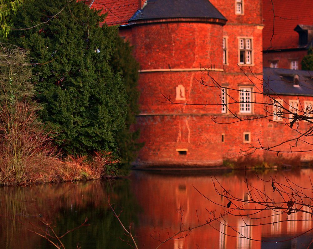 Photo panoramique du château d'Herten avec ses douves et la réflexion de l'eau