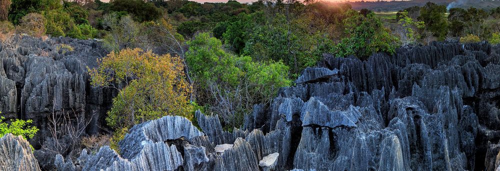 Superbe photo panoramique de la vue du Tsingy de Bemaraha à Madagascar au coucher du soleil. Ce paysage calcaire distinct est une attraction touristique majeure de l'île africaine.