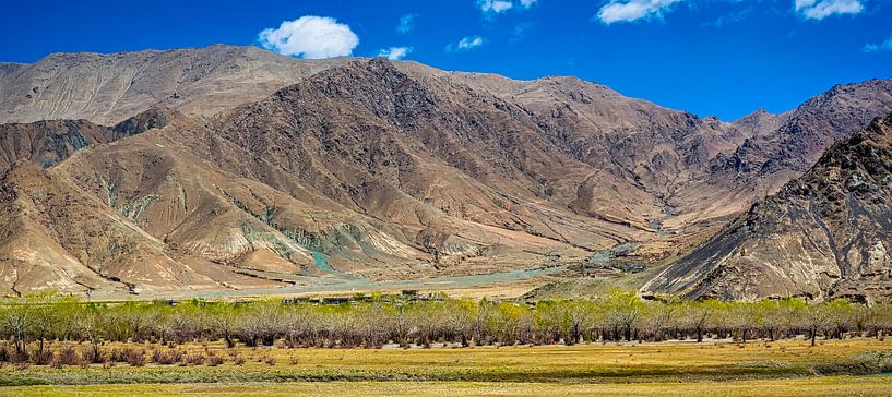 Panorama du paysage montagneux près de Gyantse, Tibet. Des arbres au premier plan, des montagnes dénudées à l'arrière-plan. L'eau coule des montagnes dans la rivière.