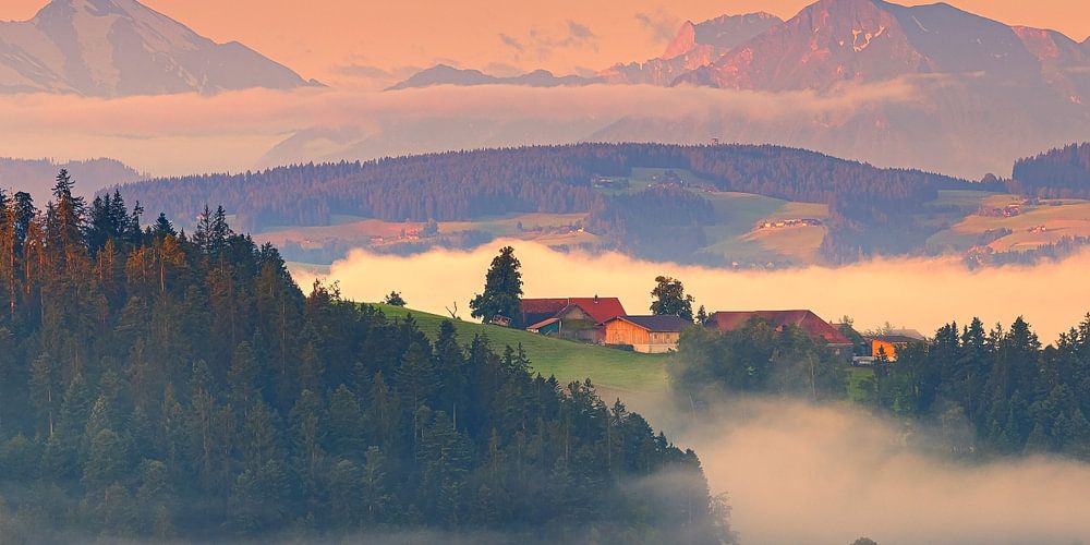 Achetez cette œuvre d'art de paysage Panorama et lever de soleil dans l'Emmental, Suisse par Henk Meijer Photography sur toile, aluminium, ArtFrame ou photographie (encadrée), impression d'art en haute qualité et tout format.