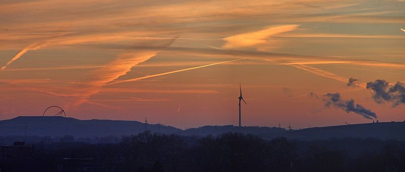 Lever de soleil sur la région de la Ruhr à Herten avec l'éolienne et l'observatoire céleste ainsi que les traînées de condensation des avions