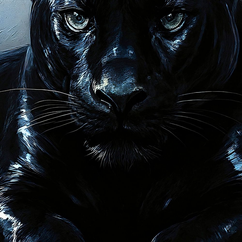 La panthère est allongée dans une pose élégante, son pelage brillant est représenté avec une grande attention aux détails et à la réflexion de la lumière. Les puissantes pattes avant au premier plan donnent de la profondeur et de l'intensité à l'image. L'arrière-plan abstrait aux coups de pinceau dynamiques renforce l'énergie de la scène et souligne l'attitude gracieuse de la panthère.