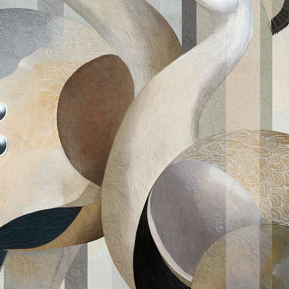 Portrait abstrait de deux paons dans des tons principalement bruns, beiges, taupes et verts doux sur papier grossier.
