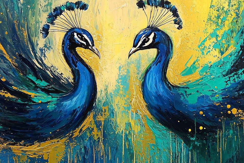 Cette œuvre d'art colorée représente deux paons dans un style abstrait qui respire l'énergie et l'élégance. La riche combinaison de couleurs bleu, vert et or, associée à des coups de pinceau dynamiques, crée une composition vibrante et expressive. Parfait pour ajouter une touche de sophistication moderne à n'importe quel espace, ce motif capture la beauté majestueuse des paons et l'associe à un flair artistique unique. Idéal pour les amoureux des animaux et de l'art abstrait, ce tableau donne vie aux salons, salles à manger et autres intérieurs. Laissez votre mur briller avec cette étonnante représentation de la nature et de l'art.