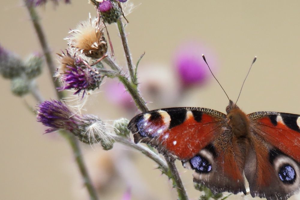 Un papillon paon-du-jour se repose brièvement sur un chardon, baigné dans la douce lumière estivale. Les chaudes nuances rouges de ses ailes offrent un magnifique contraste avec le capitule violet, tandis que ses taches oculaires caractéristiques s’illuminent subtilement. Les papillons s’attardent rarement longtemps, mais en cet instant…