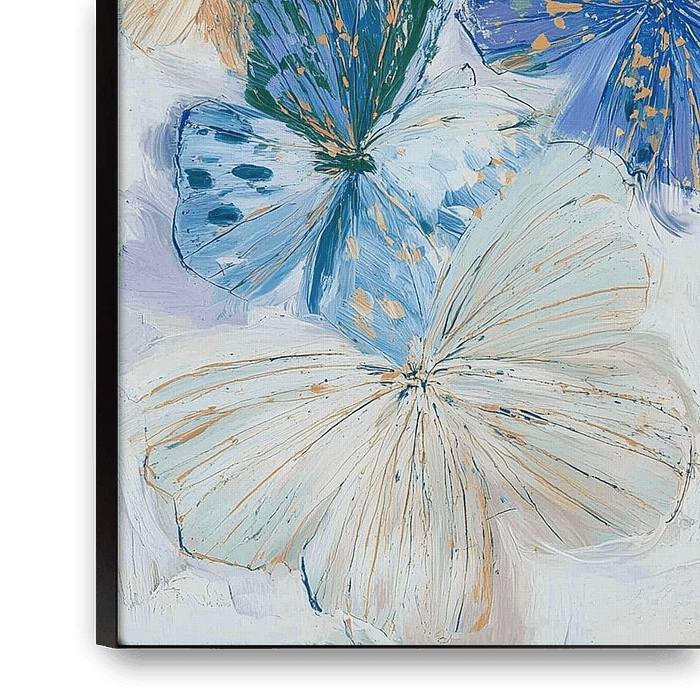 Scène vibrante de papillons en vol, exécutée dans un style impressionniste avec des coups de pinceau saisissants. Les ailes sont composées de nuances de bleu (couleur), de vert (couleur), de beige, de blanc et d'accents d'orange doux et d'or. Les points d'or sur les ailes confèrent à l'œuvre une dimension magique, presque…