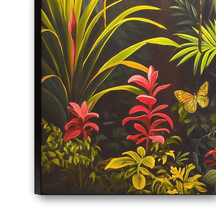 Les papillons, avec leurs couleurs vives et leur stature fragile, sont la pièce maîtresse de l'œuvre. Ils volent gracieusement parmi la verdure luxuriante, tandis que la flore colorée de la jungle ajoute un sentiment de splendeur exotique et de dynamisme à la composition.