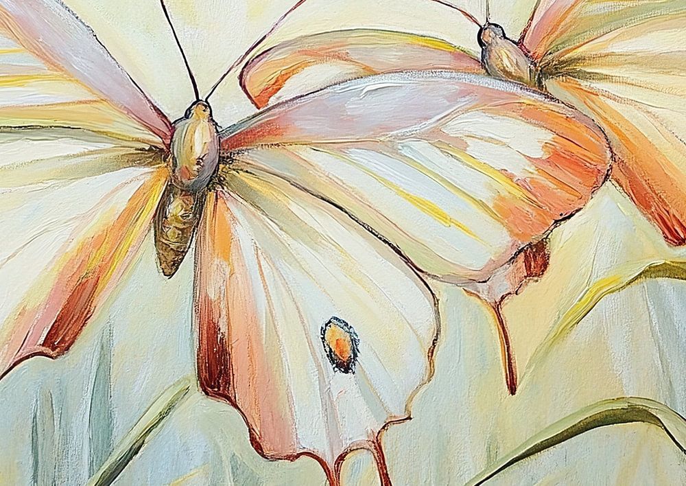Papillons d'été dans l'herbe - Ce tableau représente deux beaux et grands papillons aux couleurs subtiles orange et blanc qui voltigent au-dessus de brins d'herbe verts dans un jardin ensoleillé.