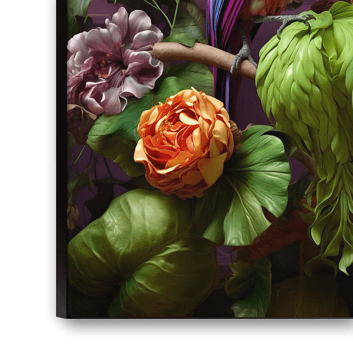 Belle pièce de décoration. Un joyeux perroquet dans les tons violet-rose sur un décor de fleurs tropicales. Avec, en arrière-plan, un panneau décoratif tropical classique en forme de l'ouil.