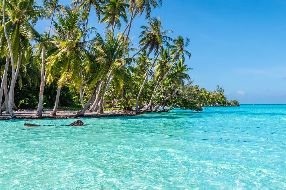 Laissez-vous transporter dans une scène paradisiaque sur l'île enchanteresse de Tahaa, en Polynésie française. Cette photo aux couleurs époustouflantes montre un groupe de cocotiers se balançant gracieusement sur le sable blanc, entouré d'un lagon cristallin. Le soleil fait scintiller la mer, tandis que l'eau turquoise se jette dans un ciel bleu clair où flotte un seul nuage, véritable œuvre d'art naturelle.