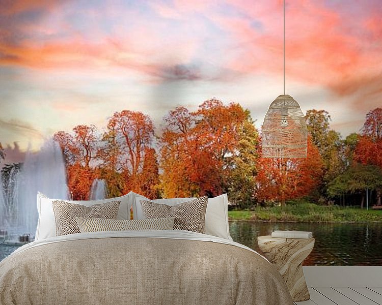 Paysage d'automne au coucher du soleil près de la fontaine du parc municipal de Maastricht, aux Pays-Bas.