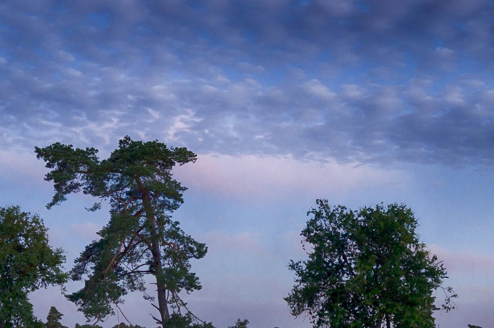 Photo prise en soirée dans le parc national de Loonse et Drunense Duinen, après le coucher du soleil. Cette photo sereine montre 3 arbres dans la plaine de sable, avec une belle formation nuageuse au-dessus, sur un fond bleu.
