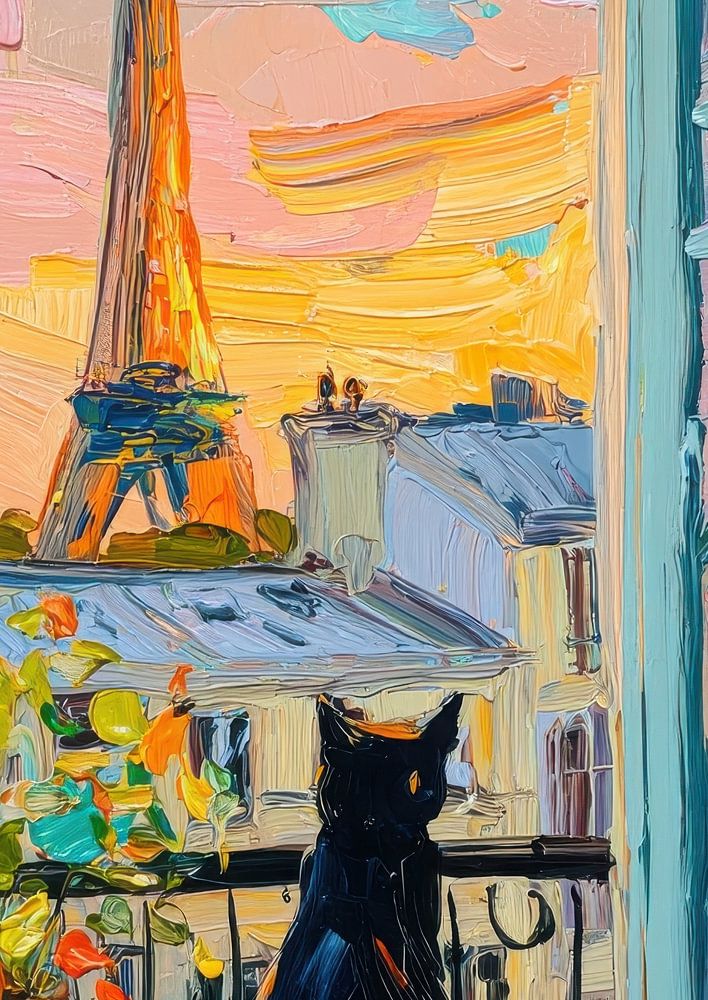 Cette peinture à l'huile impressionniste montre un chat noir sur le rebord de la fenêtre d'un appartement parisien, regardant la Tour Eiffel. Des pots de fleurs colorés et un coucher de soleil pastel complètent la scène. Des coups de pinceau puissants et expressifs et des couleurs vives créent une atmosphère chaleureuse et romantique. Une lumière délicate et des tons pastels doux créent une ambiance de rêve qui capture la vie urbaine confortable de Paris. Idéal pour les amateurs d'art impressionniste, les amis des chats et tous ceux qui apprécient les paysages urbains colorés inspirés de Matisse, avec du cœur et du charme.