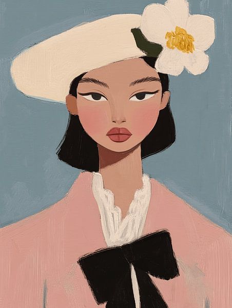Elle ne dit rien, mais vous savez exactement ce qu'elle pense. Ce portrait élégant combine des couleurs douces avec une attitude confiante et un clin d'œil subtil. Le béret est parfaitement ajusté, le nœud est juste de la bonne taille et son regard ne se laisse pas presser. Ce n'est pas une décoration qui demande de l'attention, c'est…